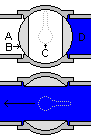 Cross-section of typical ball valve; A is barrel, B is ball, C is handle (not actually in the plane of the cut), D is chamber