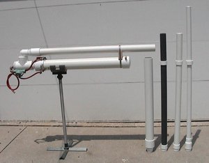 An Over/under launcher is one where the barrel is turned 180* (using 2 90° elbows, typically) so that it points in the opposite direction of the chamber, and is directly above it. This makes the total launcher length shorter, although the 90° bends will slightly reduce flow. The design is very common in pneumatic launchers, since many valves have the input and output ports at right angles. Pneumatic chambers are also usually longer than combustion cannon chambers, so more overall length is saved.