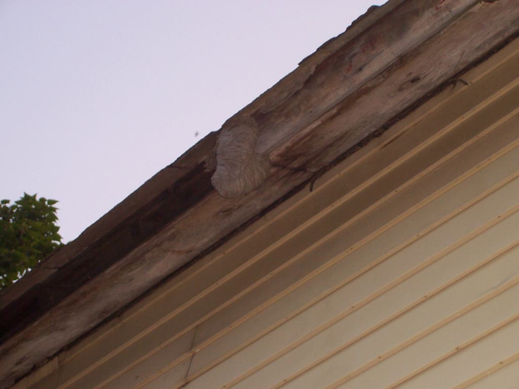 They got pretty pissed, so we started swinging a 5 foot section of 3" pipe at them/the nest. Then we just turned the gardenhose on and used the special nozzle on it's "stream" setting. It knocked the thing down and washed all the paint off.