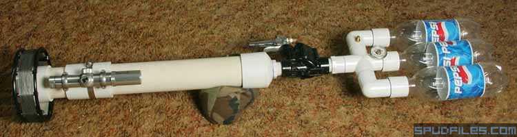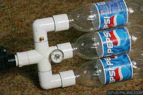 - The pressure chamber consists of three 1-liter wide-mouth soft drink bottles connected through a cross joint and two 90 degree elbows, all of 1" PVC. The pressure gauge and fill valve were installed in 1/4" NPT tapped holes drilled in the fittings.