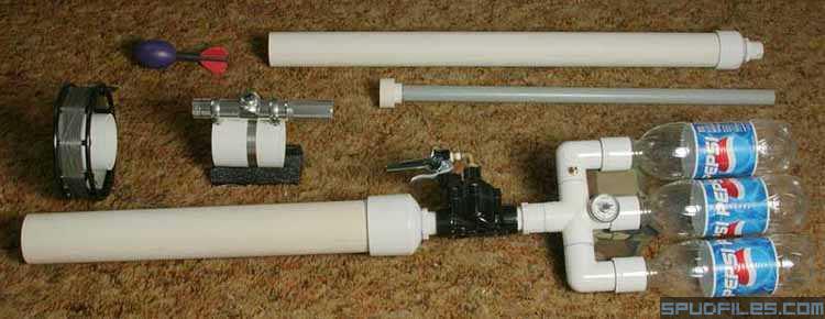 The soda bottles were chosen primarily for their light weight, but the choice is somewhat controversial. Although there are sources on the Internet that indicate the industry pressure-tests these containers up to 150psi, or that have destructively tested the bottles to 170psi, they are designed for holding pressurized liquids, and it is not guaranteed that they can hold pressurized air safely. The reader is cautioned that all responsibility for safety rests with him, and normal precautions (eye protection, protective clothing, etc.) should be used.