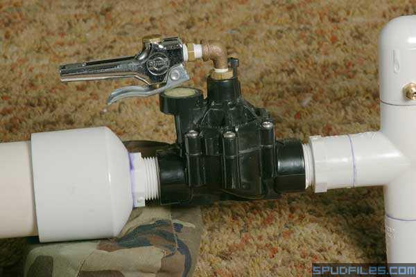 - The valve used is a Rain Bird CPF-100 1" sprinkler valve with flow control. This is the same valve as was used in the second generation launcher, but only one valve is used. A glue-in valve could also be used, which will save some in overall length, but I went with the threaded type in order to change barrels and to break the launcher down for transportation. The solenoid was removed and its housing filled with epoxy to seal it. The flow control valve was removed and the housing was drilled out and tapped for 3/8" NPT and a 1/4" NPT reducer and elbow was installed to attach the Amflo blow gun trigger valve. Note that the trigger valve is arranged on the inside of the elbow so that it won't be as easy to bump and accidentally trigger the launcher.