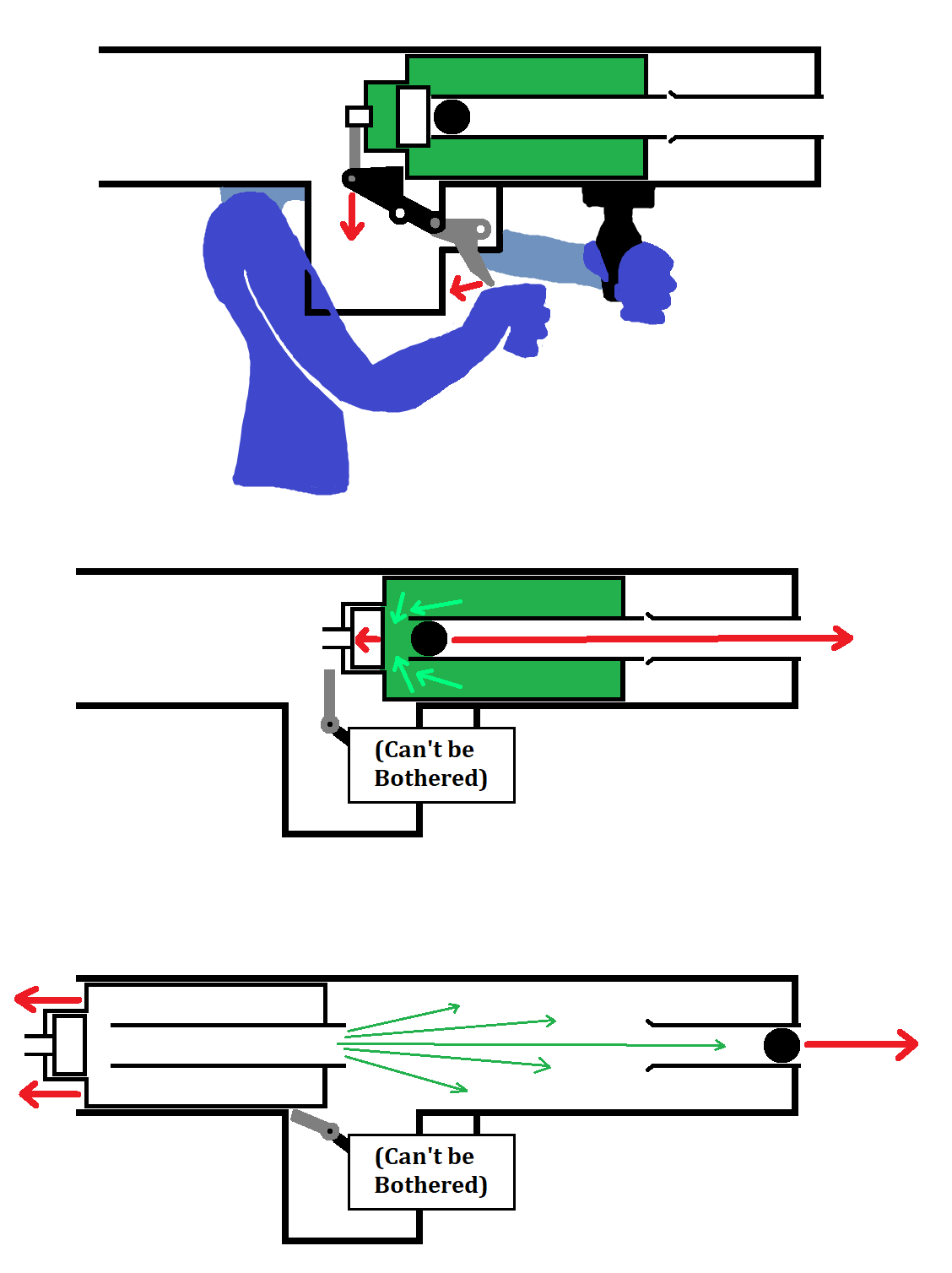 How would all the air not just simply escape from the back instead of pushing the projectile out? Your design is kinda what i had in mind with the counterweight, but the green arrow would be where the weight was sitting and the projectile would be in the longer barrel. I guess i could use a bag of water as a counter weight to reduce the risks of damaging something or someone standing behind it.