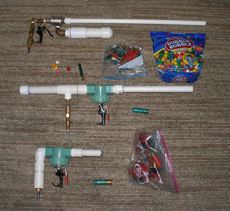 I pigheadedly stuck with using pipe for material because it appears to be scalable up and down and most importantly, the ammo I have fits in it. Gum balls.