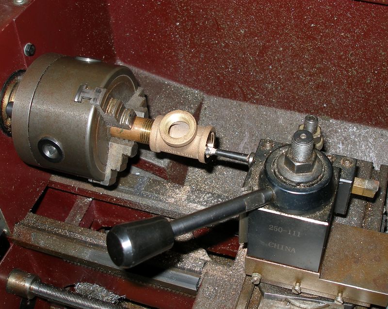 The picture shows the brass 1/2" Tee getting faced off for a good seal and threads removed from one end to allow the loading port to slide open. Doesn't look like it, but that tee is spinning at about 500 rpm. I love that camera for pictures like this. It is an Olympus SP-350.