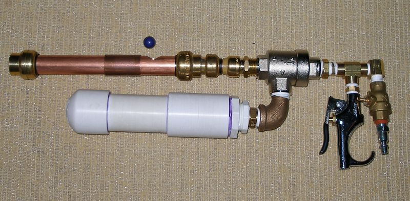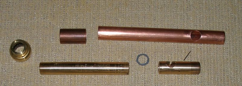 The second pic shows all the parts ready for assembly. The "roll back preventer" is a stainless pin located behind the load port. The "roll forward" preventer is a rubber washer made to exacting specs to lodge between the two inner barrel pieces and obstruct the passage of the ammo until the pressure rises a couple of psi above 1 bar. A sharkbite end cap with a big hole bored in the end holds the inside parts inside the barrel sleeve.