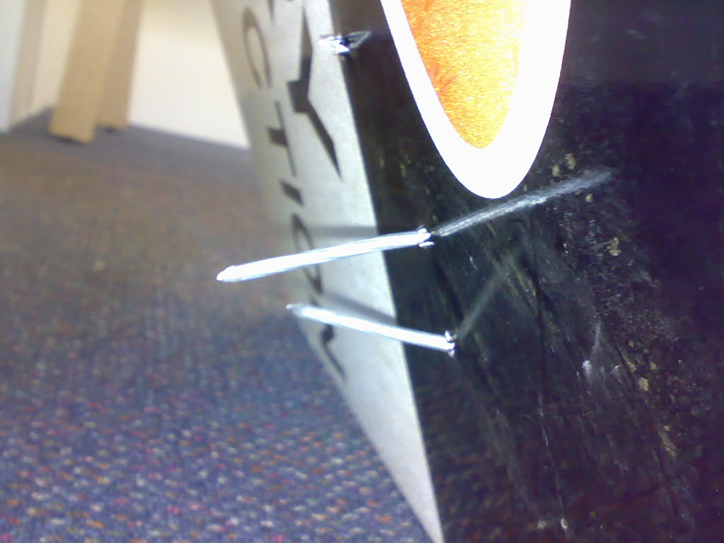 The second set of pictures are a couple i fired this morning into two aluminium signs i "found" around the neighbourhood. They all went through totally, only stopped by the head of the nail. The plastic stabilisers were sheared off by the force of the nail embedding itself. The nail sticking out was the first i fired, its only like that because at first the two signs were some distance apart, with the smaller one at the back, but i changed the config after that one.