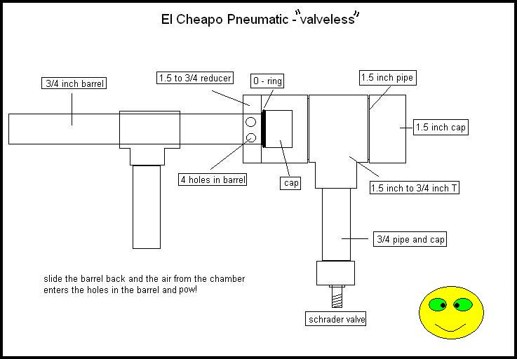 You lied! You said you wouldn't use a valve! You used a schrader valve! I'm just kidding. In all seriousness, I thought it didn't work at first, but then I read the "slide the barrel back and the air from the chamber enters the holes in the barrel and pow!" part. This might be a little retarded, but wouldn't it be kinda hard to push the barrel back with so much pressure building up behind it?