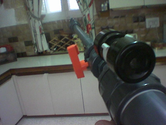 To make the sight and holder, I first found an old plastic wall clip (used to clip broomsticks to the wall and stuff), I filed down the edges and superglued it onto the gun. The sight is an old toy telescope that has approximately 1.5x magnification. It ended up perfectly straight in line with the barrel.