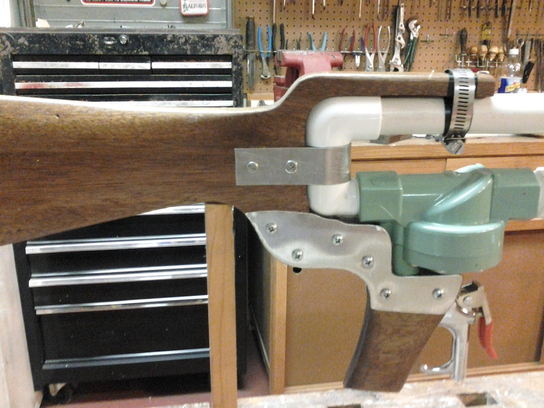 Here's my latest project. Its an air rifle with a 4 foot long 3/4 inch barrel made to shoot spent 12 gram CO2 cartridges. I carved the stock and grip by hand from a single piece of teak. All the metal plates also started out as raw sheet metal that I cut and filed down by hand. I decided to go with a manual valve for simplicity and the fact that the solenoid would have been in the way.