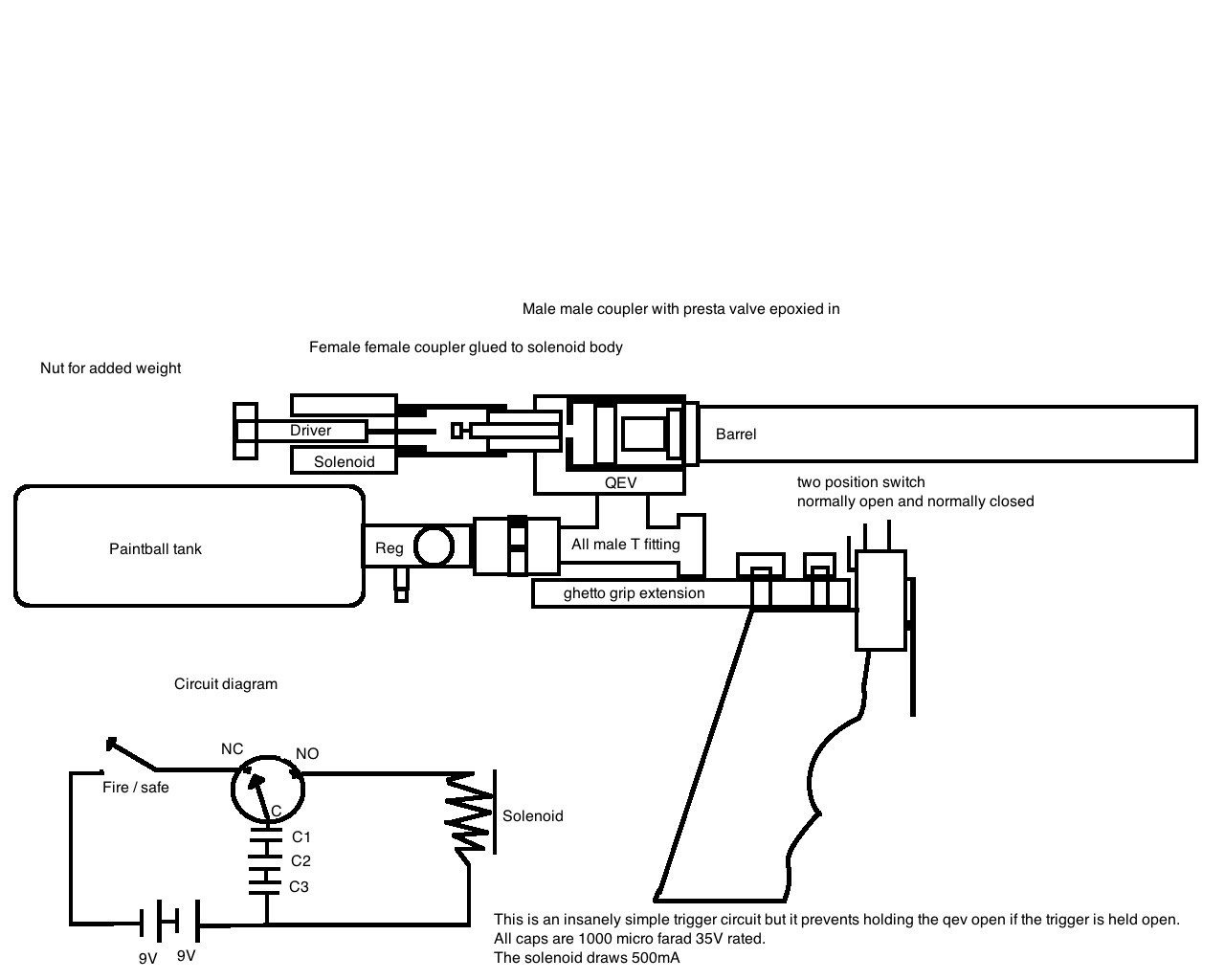 I built a circuit that allows the solenoid to be driven from a capacitor bank that are charged by two 9V batteries (seen onboard in the picture in a project box. Adding or removing capacitors allows me to adjust the dwell time of the solenoid I currently have it opening the valve for 30 milliseconds. This also allows the trigger to be pulled and held while only actuating the solenoid one time (like a semi auto marker) the capacitors recharge when the trigger is released.