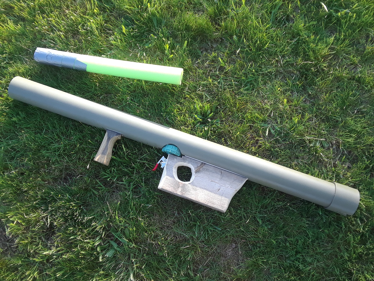 internals are a simple sprinkler valve based spud gun. i know its rough but im not sure if i want to keep the grips natural or paint them green with the rest of it. about 20psi will launch the pool noodles a good distance for nerf but they have an awful lot of mass to them - too much to shoot a 5 year old kid with (my competitor) and im not sure if there's anything i can do about that besides just making the darts smaller. but the barrel can be swapped for any size pipe so this could be used for airsoft/paintball/whatever