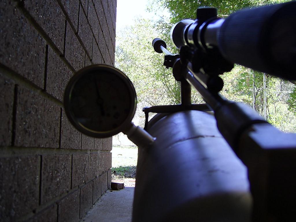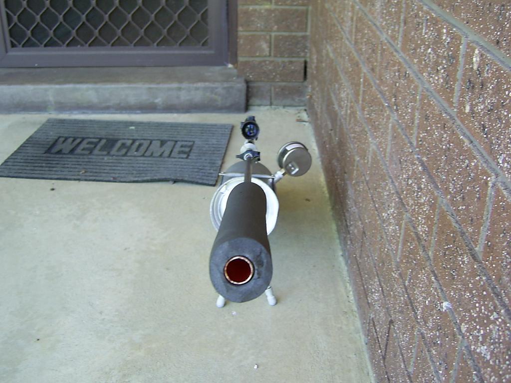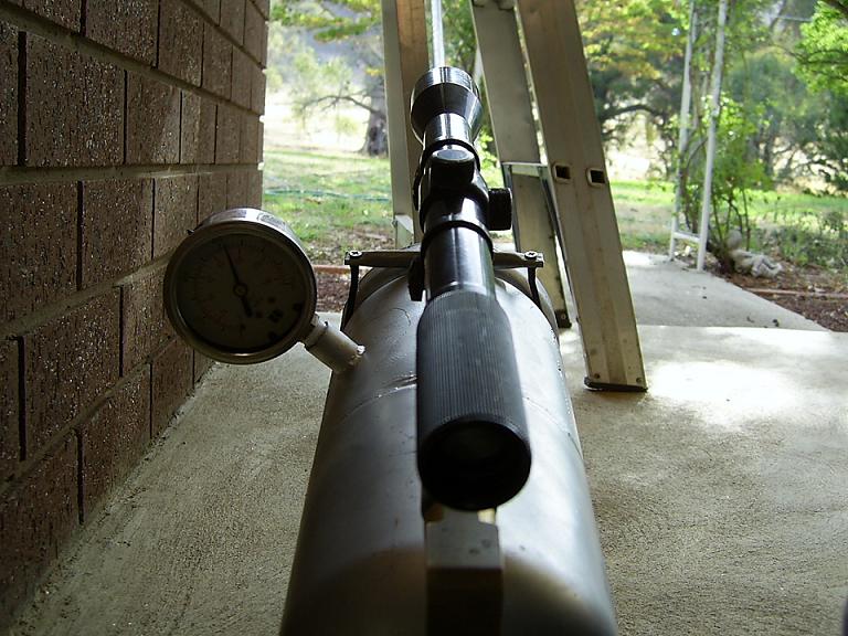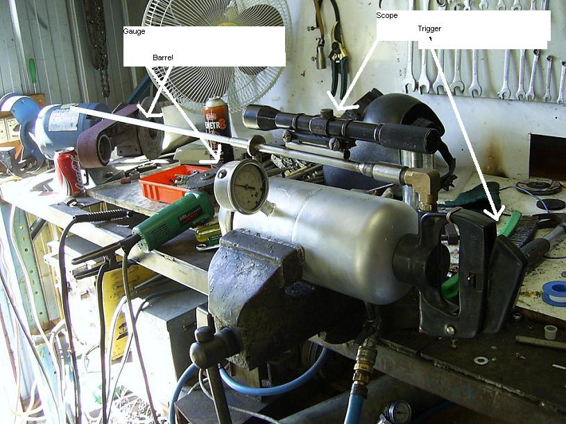 yer its real hard to do that right now coz i don't have a video camera, but i wanna get one soon thats a good idea, i tried slowing it down with he camera i got which is just a little digital camera, but you cant see a thing, what i need is a camera with a very high frame rate so i can go frame by frame through the video and see how fast the rivet is actually going. another problem i got with that barrel is that it only takes the slightest bump to bend it, after putting the bolt in it has made it easier to bend, therefore every time i wanna shoot it, it needs to be sighted in again if i am using the sight. i think i might try and weld some supports off it so the bolt wont bend and it might help i dunno, but i also want to get another fire extinguisher and cut the top off it and weld to the bottom of the one i have mounted on it already giving me twice as much air and i might get more shots out of it, either that or i make it smaller and i use a pressure pump and pump up the cylinder by hand