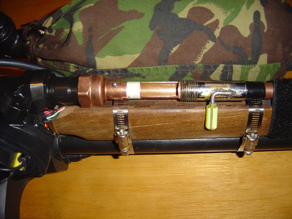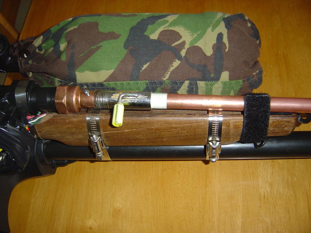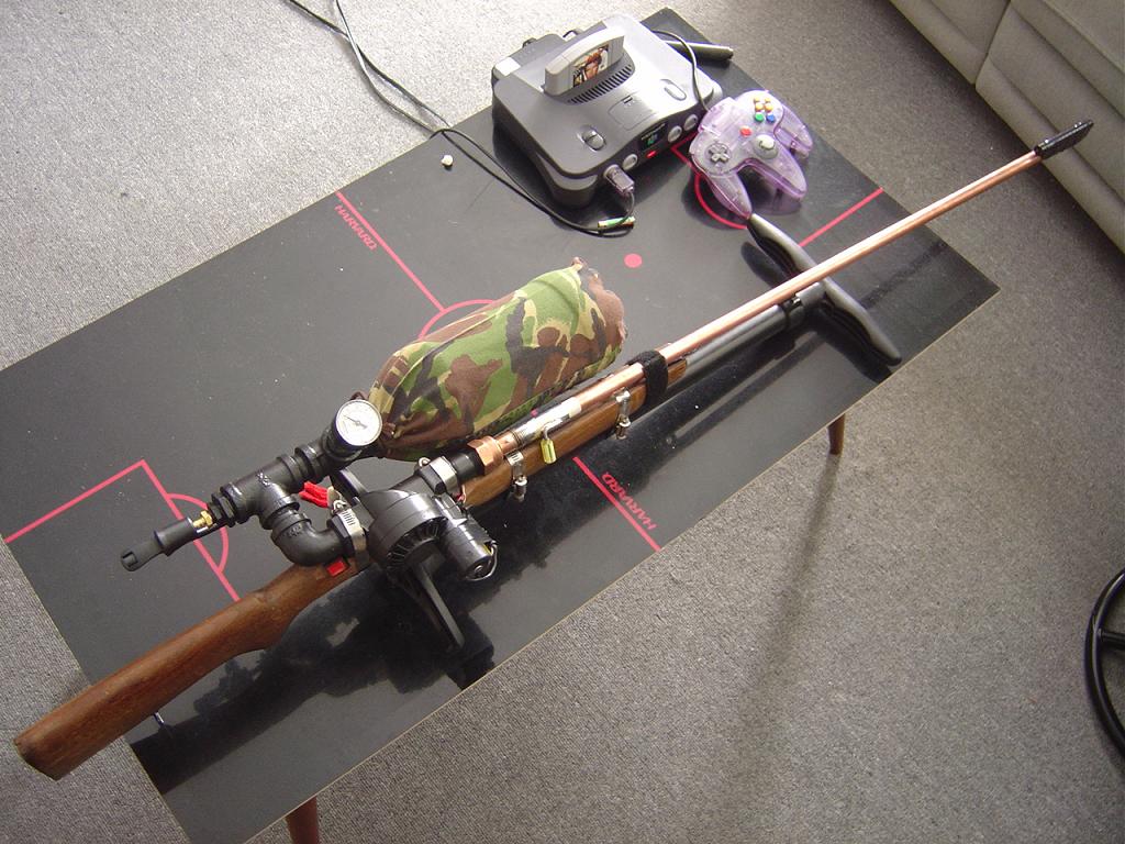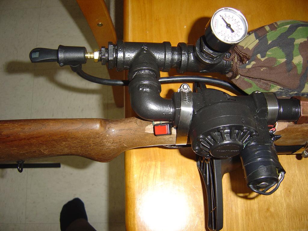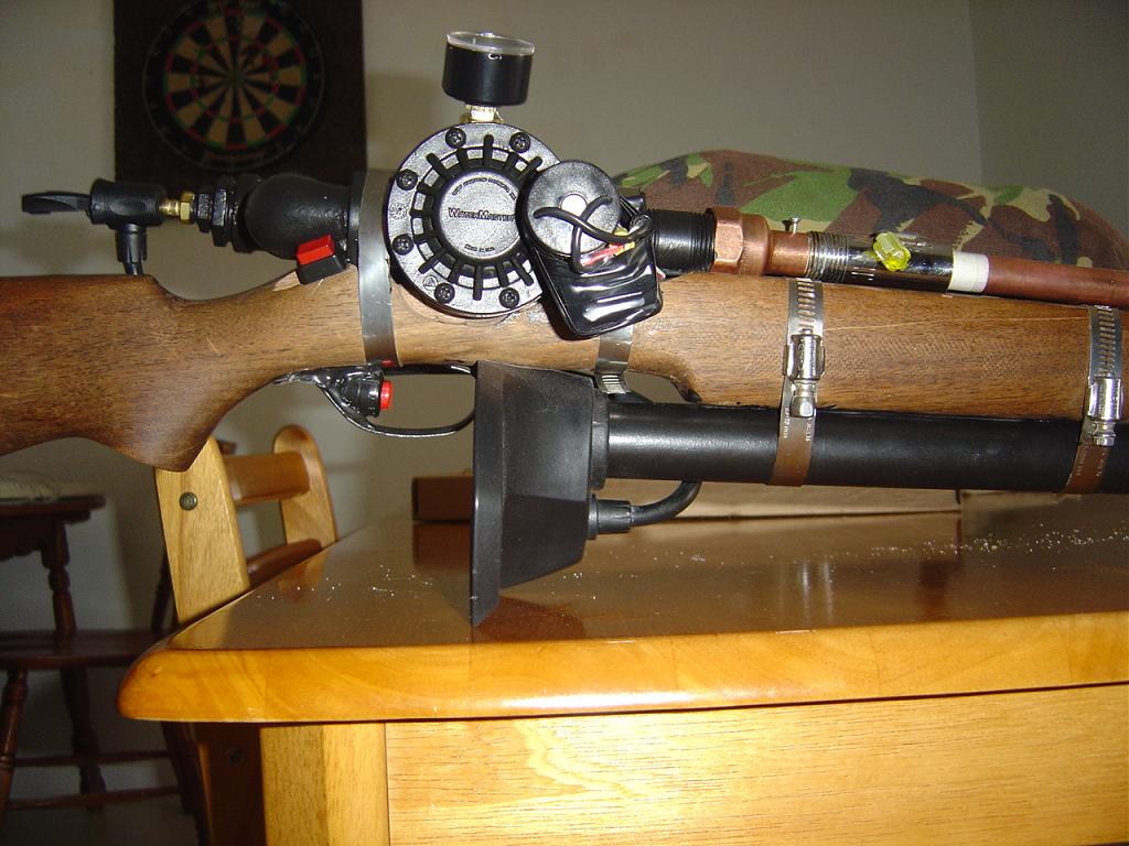 This (my first pneumatic!) particular rifle was designed to be portable, and most importantly easy to pump, reload and fire (and not cost a million bucks in parts). I didn't want to lug the pump around in a backpack or have to attach and detach it all the time to fill it or have to hook it up to a compressor. It is simply the airflow assembly, pump, and stock all sandwiched together using steel collars to hold it to the gun stock.