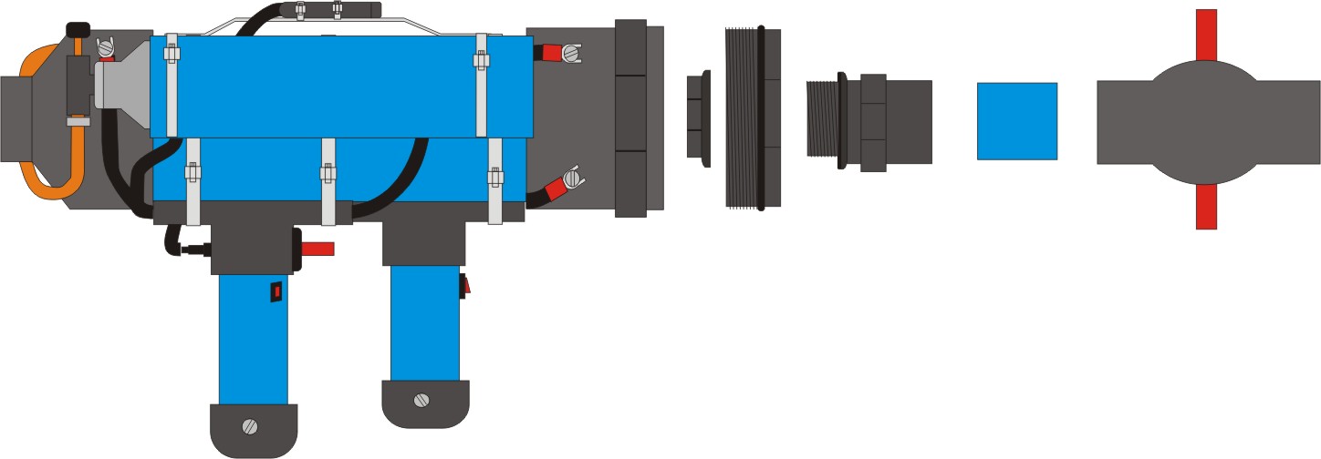 It's a 4" socket to 4" Male threaded adapter, 4"spig to 2" socket reducer bushing, 2" spig to 1" female threaded reducer bushing, 1" steel close nipple then screwed into the PVC valve.