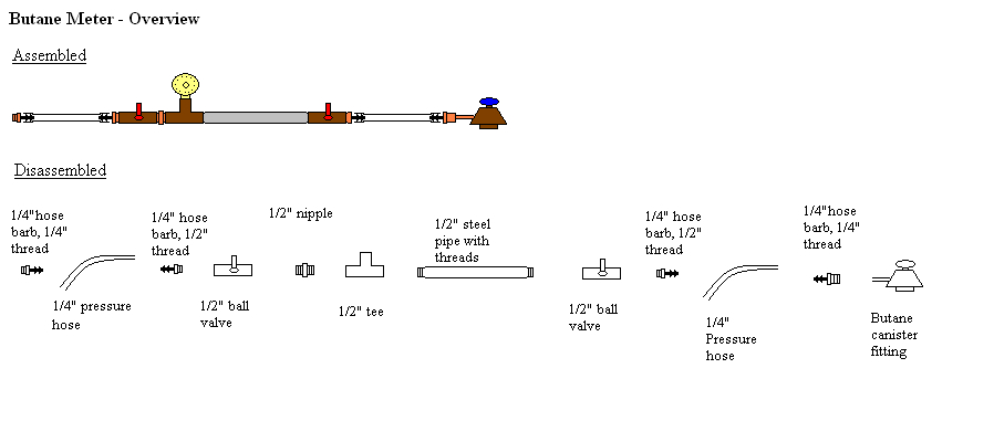 On the attached diagram of the butane meter its shows a 'butane cannister valve'. This is basically the top valve that i got off a portable butane-powered blowtorch. It shows on the diagram that a hose barb will connect to this valve; i will most likely weld this on. If the pressure hose fits nicely to the butane cannister valve i will simply clamp the hose straight to the valve, but it is not an issue.