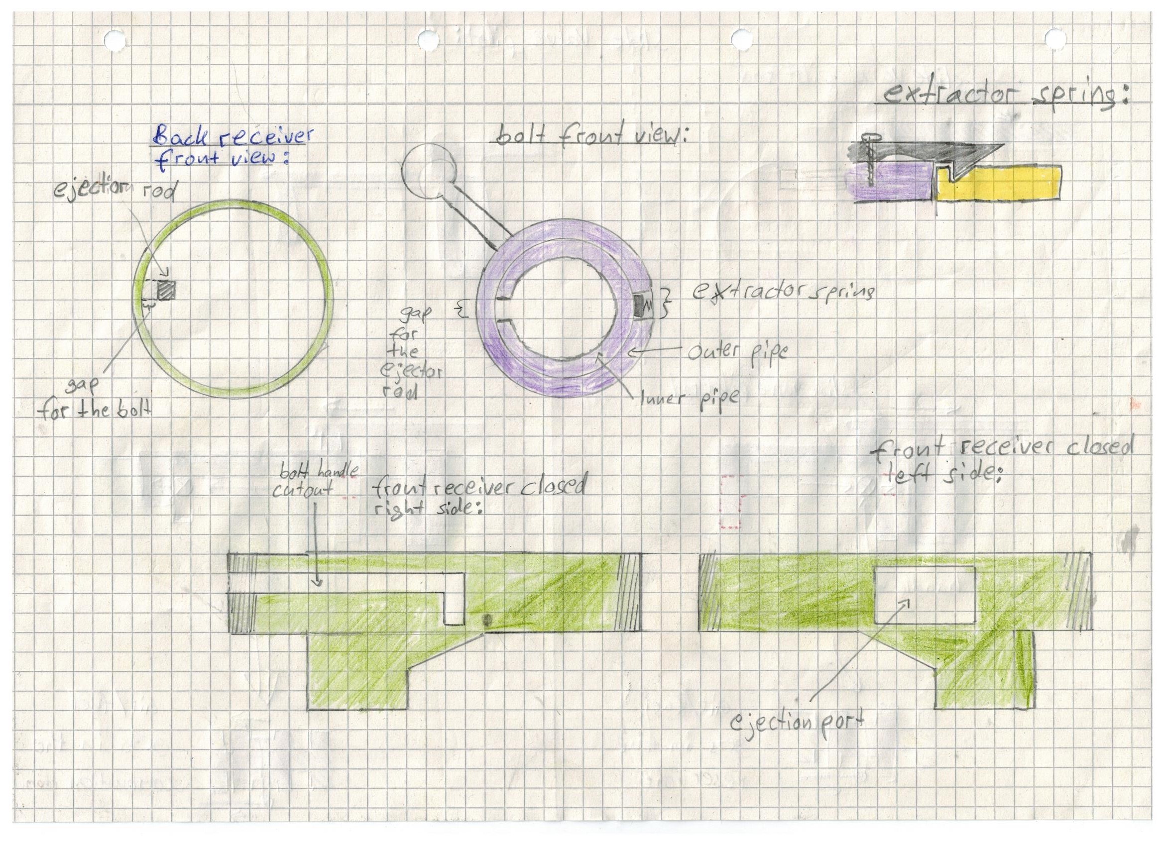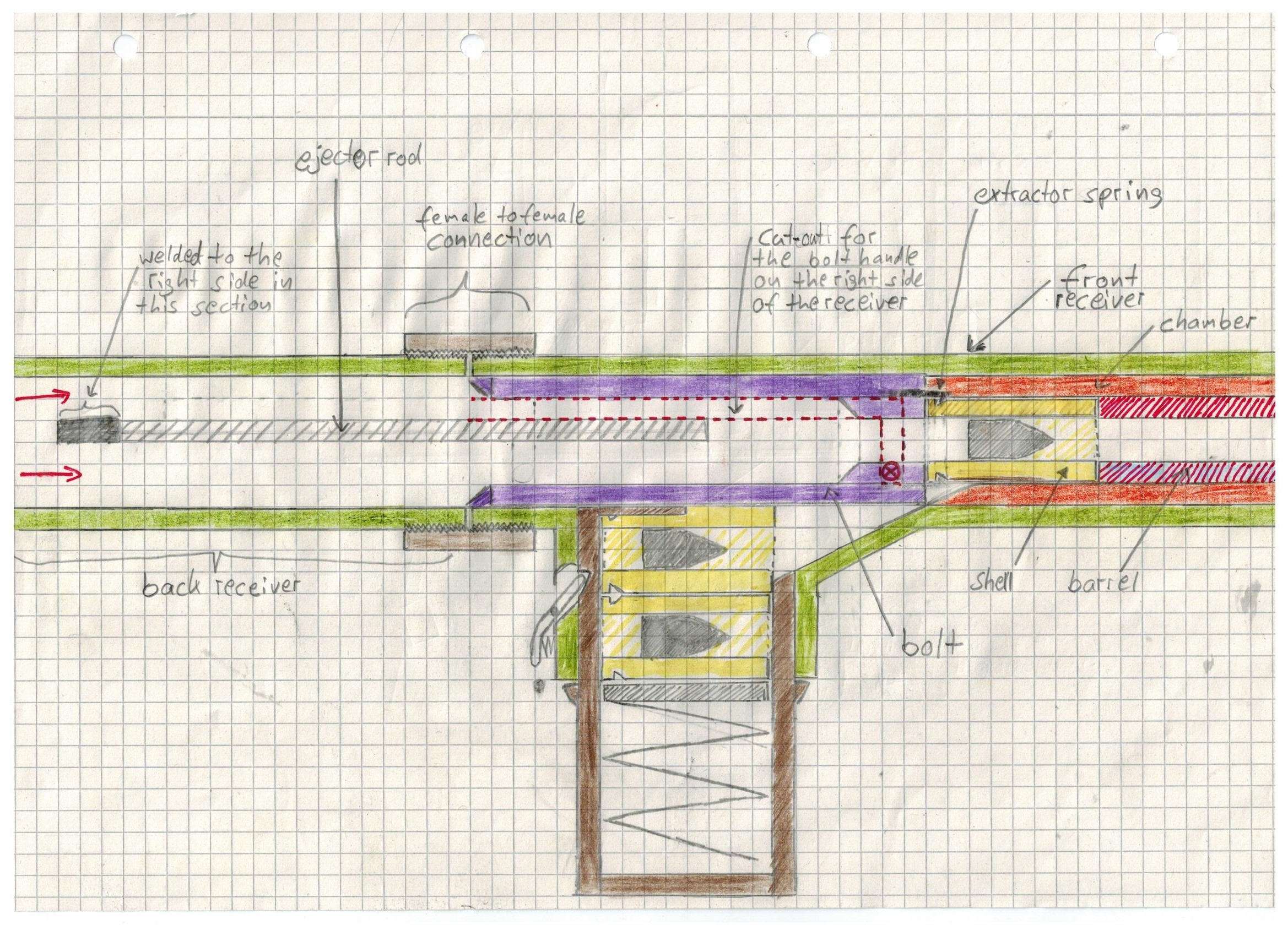 For reloading you pull the bolt back again and the extractor spring will pull the shell out and the very long ejector rod will eject it to the side trough the ejection port.