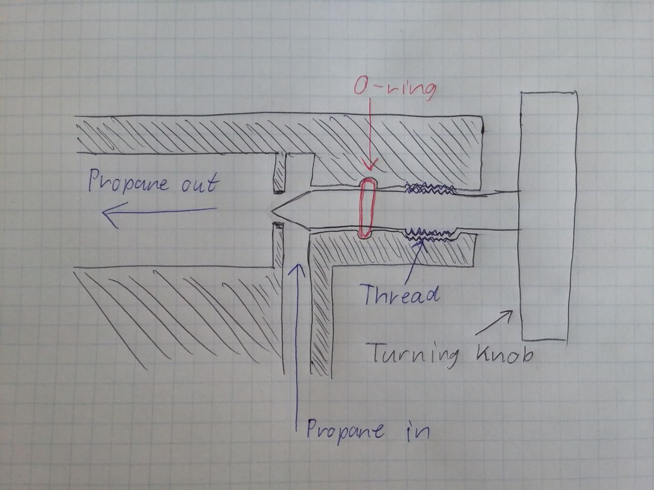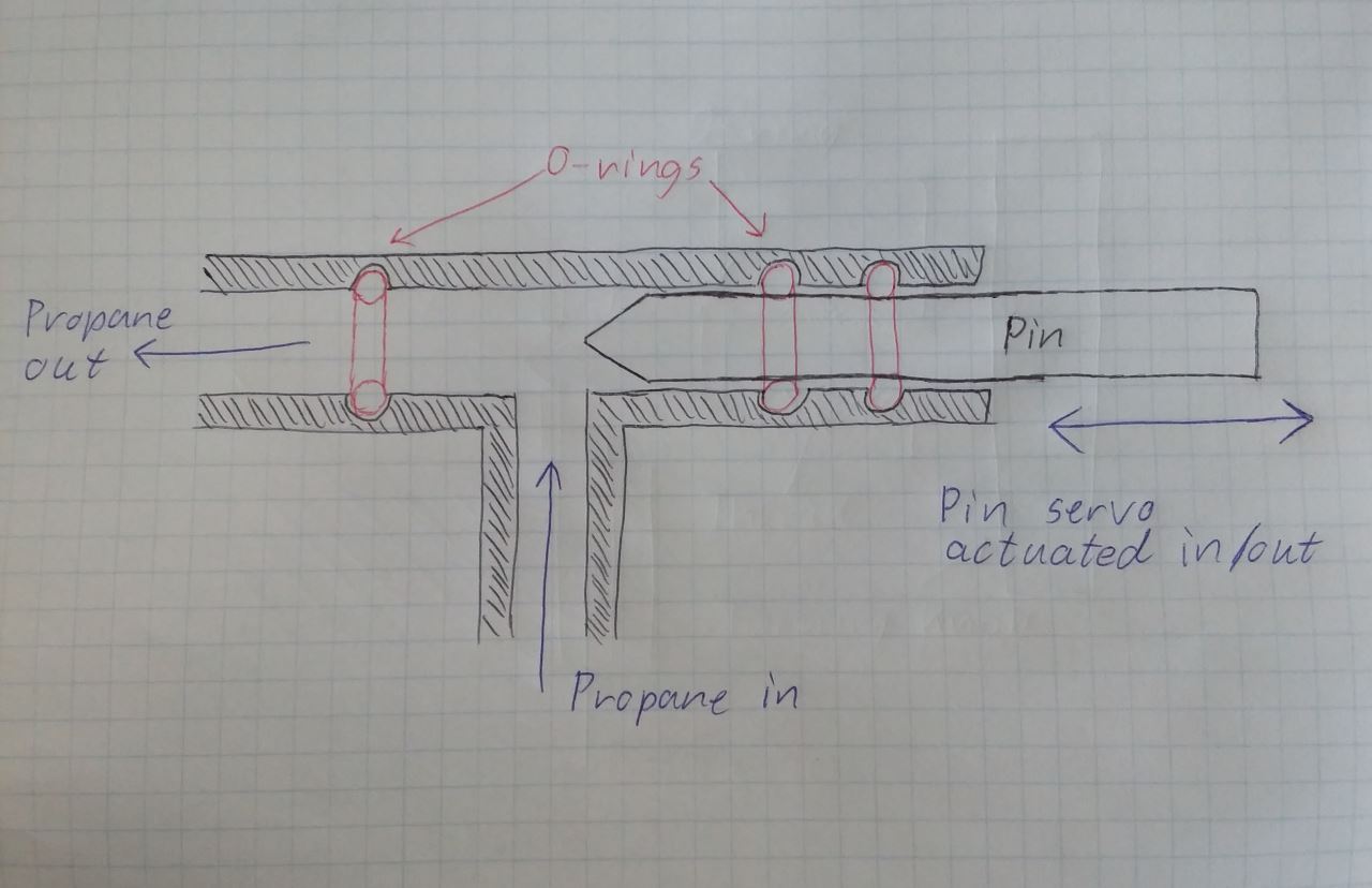 I have been thinking about a design as attachment number 2, simply a pin that goes into an O-ring and seals off the propane flow. Would this work? Or would the O-ring be a weak link? What would happen if liquid propane would enter by accident, would it block up the movement of the pin into the O-ring? I would of course have something that keeps the pin from shooting out to the right.
