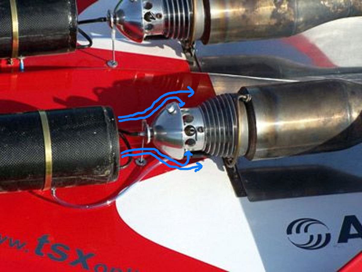 If it works when static but not in the air, the logical conclusion would be that it's getting too much air when in flight. With you level of expertise it shouldn't be too hard to cook up a carburetor type valve that can be adjusted in flight with a servo to limit the amount of air fed into the system, or alternatively make a blower that can simulate in-flight airflow on the ground so you can pre-set the restriction for a typical airspeed before takeoff.Futterama wrote:Now the question is, do I get too much air into the air intake or not enough? The easiest to do would be to restrict the air flow and start there, see if less air will make a difference. If not, I will have to make a bigger air intake or start fiddling with forced air from a blower but I hope the natural air intake will do.