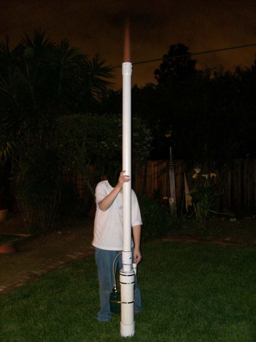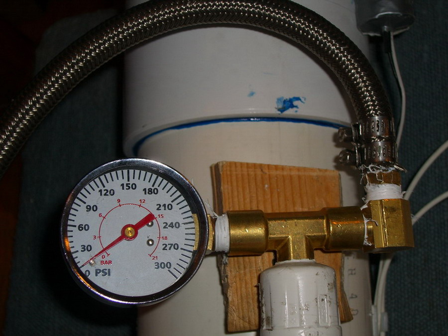 The propane meter is quite simple. Starting from the barrel I have a ¼ inch steel street elbow, a ¼ inch steel close nipple, a 1/4inch by1/2 inch steel coupling, a ½ inch sch 80 PVC close nipple, a ½ inch sch 40 PVC ball valve, a 4 inch long ½ inch sch 80 PVC nipple (this will vary based on volume of chamber), a ½ inch sch 40 PVC ball valve, a ½ inch sch 80 PVC close nipple, a ½ inch sch 40 cap with ¼ inch threads tapped into the top of it, a ¼ inch brass tee with a 1-300 PSI pressure gauge in one side and a ¼ inch brass street elbow in the other side, out of the elbow a ¼ inch by ¼ inch brass hose barb, connected to the barb is a length of braided hose used to hook up toilets, the other end if the hose is clamped to an old propane torch. All the sch 80 nipples are sprinkler risers and are available at any store that sells sprinkler supplies. The propane meter is tapped into the chamber at the end with the cleanout plug.