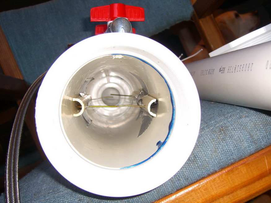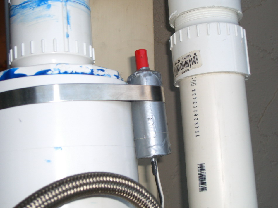 This is the newly built Potato Eliminator. I haven’t tested it yet. The chamber is an 18 inch long piece of 4 inch shc 40 PVC. On one end I glued a 4 inch female adapter and on the other a 4 inch coupling. In the coupling I glued a 4 inch spigot by 2 inch female thread bushing.