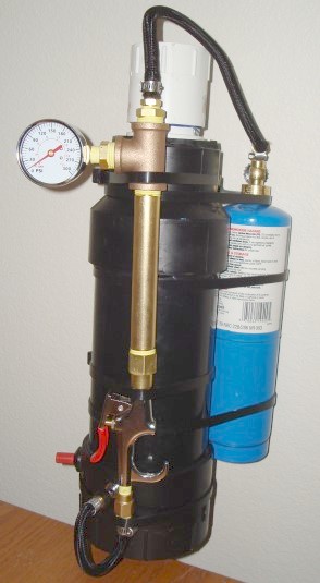 Propane and meter system with valve from a propane torch and a blowgun for the other. This screws into a tire valve at the base of the combustion chamber. Hose is from a broken bike pump.