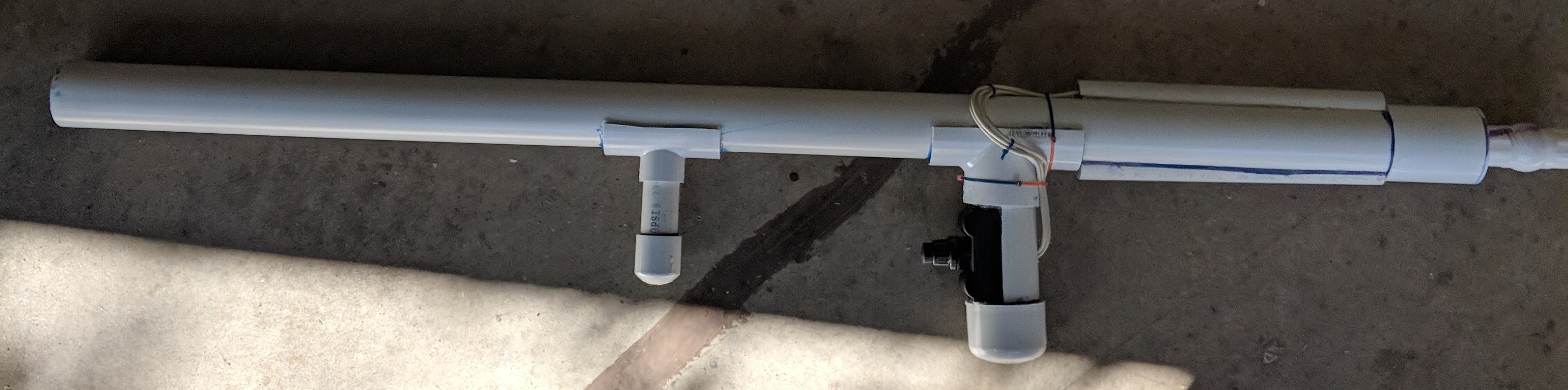 The cannon is a 4 foot piece of 2" Sch. 80 PVC with a 3 foot long section of 1.5" sdr21 shoved into it to make the barrel. The body of the cannon also operates as the combustion chamber, making it require almost no fittings!