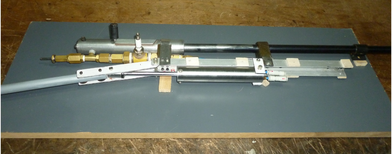 The front tube houses the small liquid butane gas tank, and has its manually operated valve (pressed with the finger), to introduce the gas to the dosing system, about 6ml.