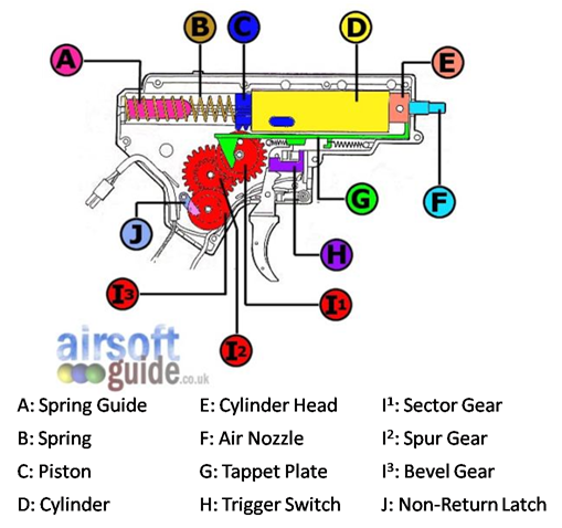 I already know how an AEG gearbox runs on full auto, but I'm still not quite sure how the semi-auto function works. I researched and found out that: "If semi-automatic fire has been selected, the sector gear activates an electrical cut-off as it returns to its starting position. This stops the cycle where it started ready for the next shot. If fully-automatic fire has been selected, this cut-off simply does not engage, allowing this cycle to be repeated over and over until the trigger is released." (www.airsoftguide.co.uk/asgdbase.php?rhs=no&id=WhatIsAEG)