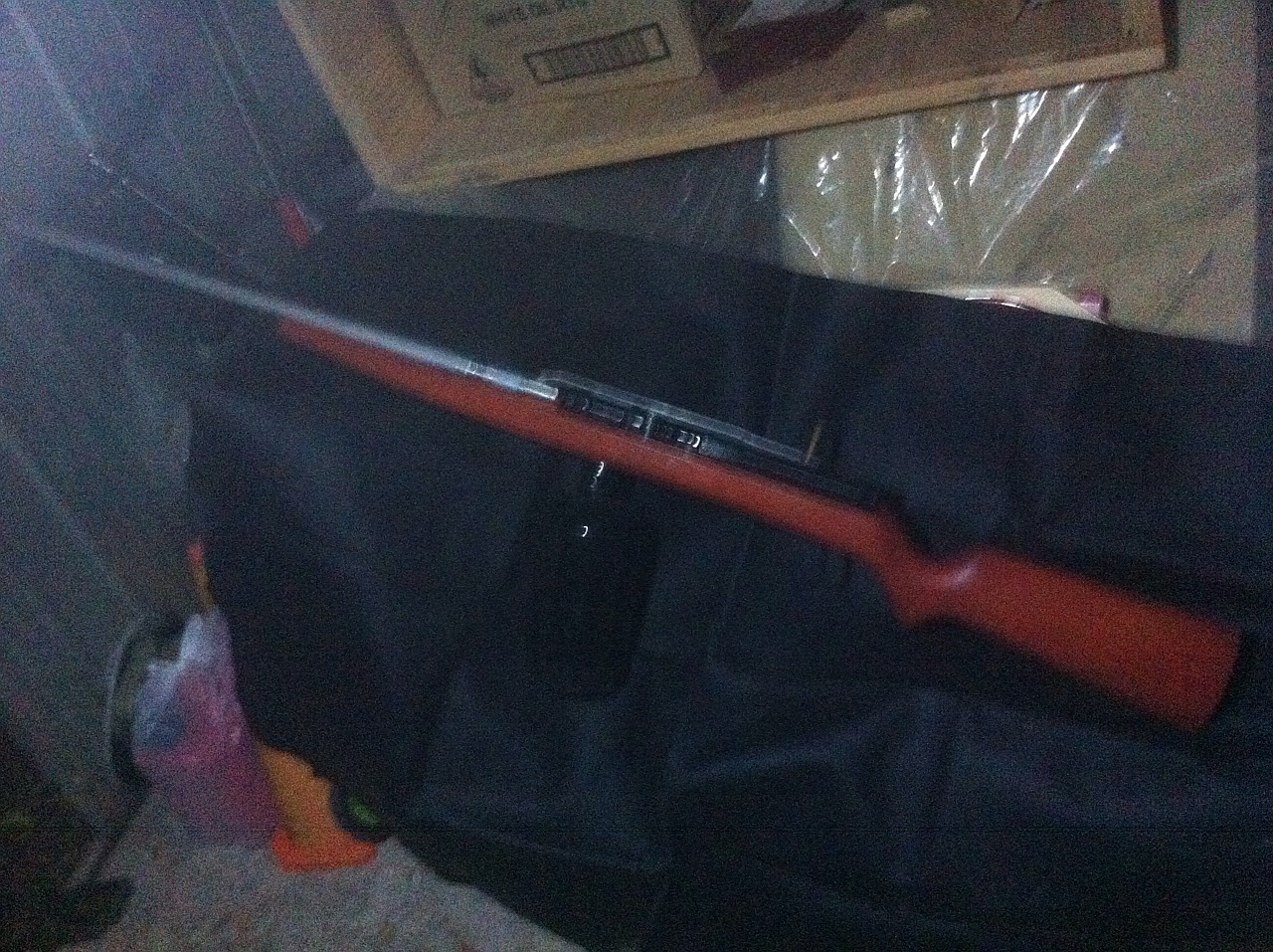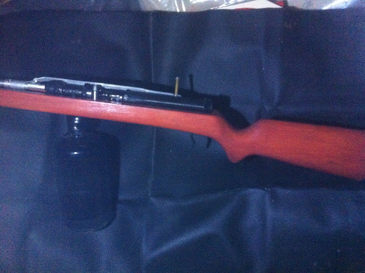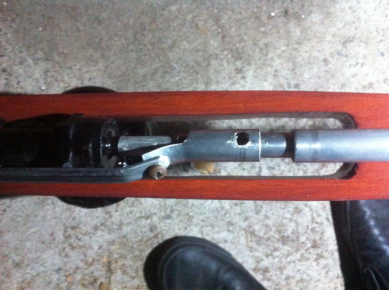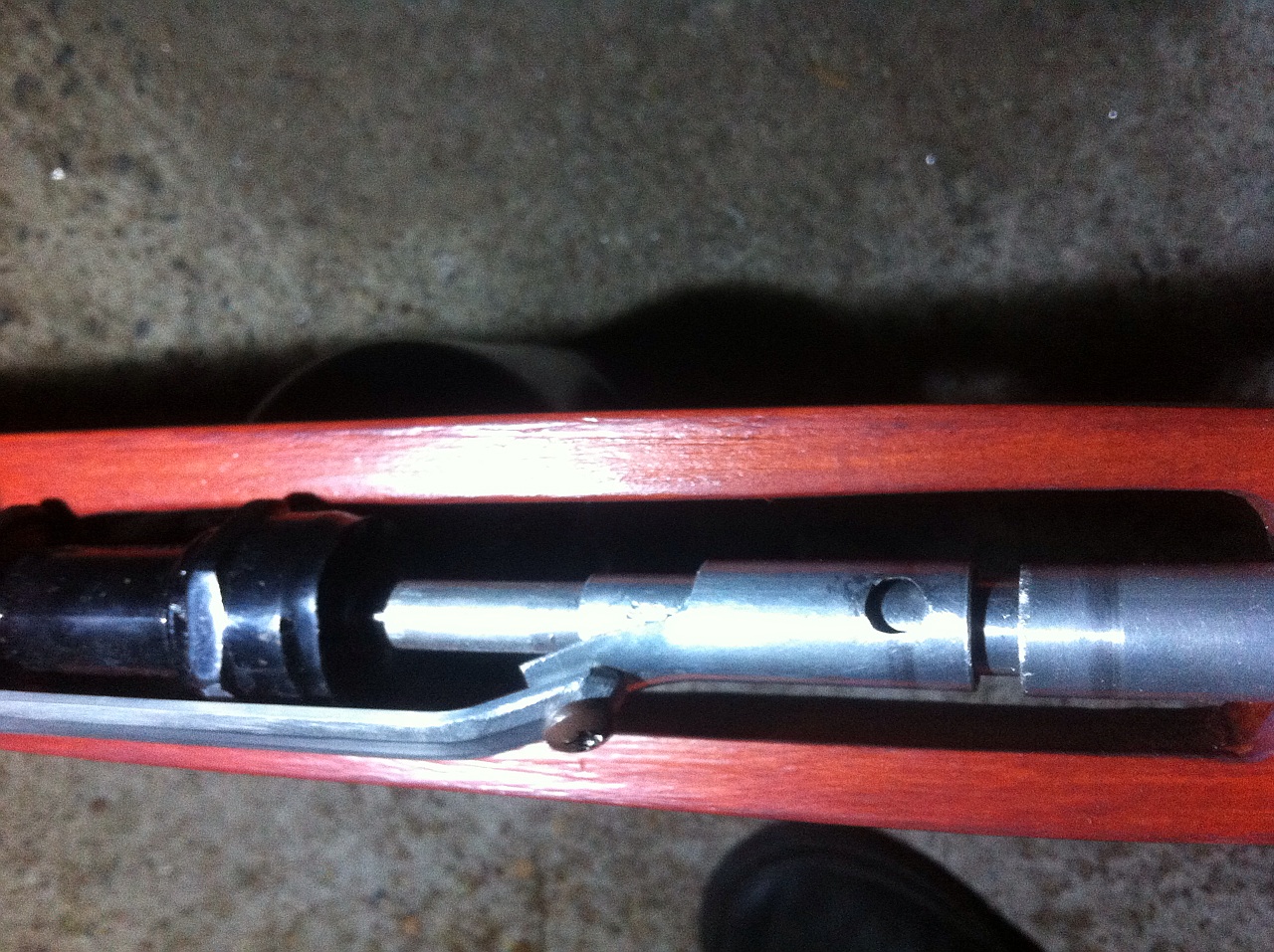 On the finished rifle there is no slot to slide the lever into,instead there is a small hole for a sprung screw for the piston to catch on when pulled back the screw is attached to a lever so when the lever is pushed the screw comes out of the hole and releases the piston.