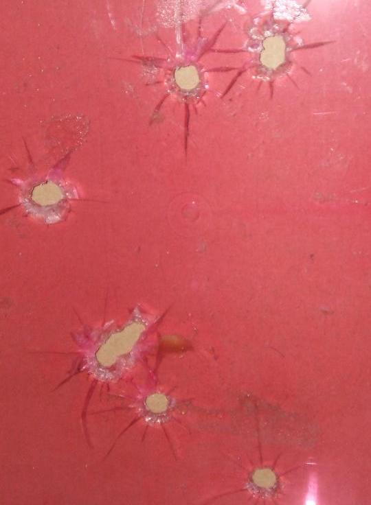 Just a quick ten round burst, double feeds galore, but look what it did to that 1/8" thick acrylic (with the BBs being totally pulverised against the hard surface behind it):