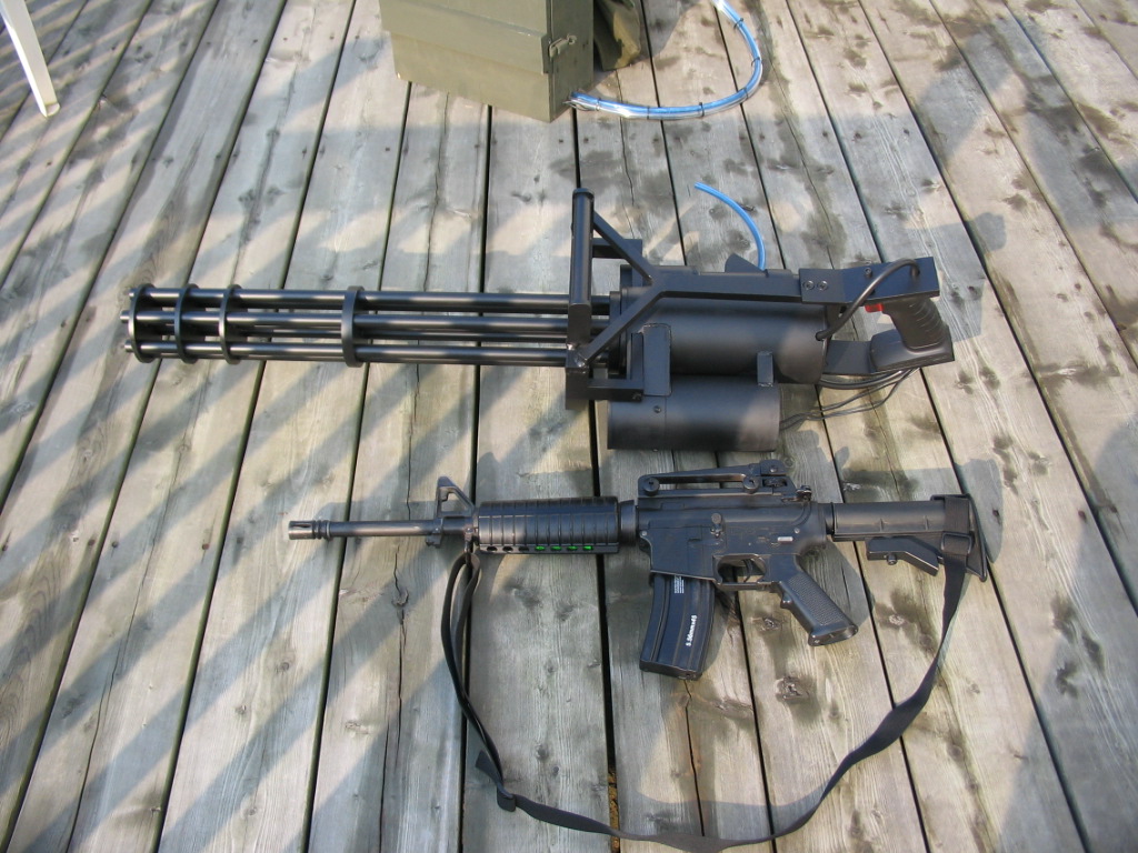 I'm building an airsoft minigun. All is almost done now. Is fire throught a hidden barrel in the middle of the rotating barrels. I have installed an airsoft hop-up units with it.