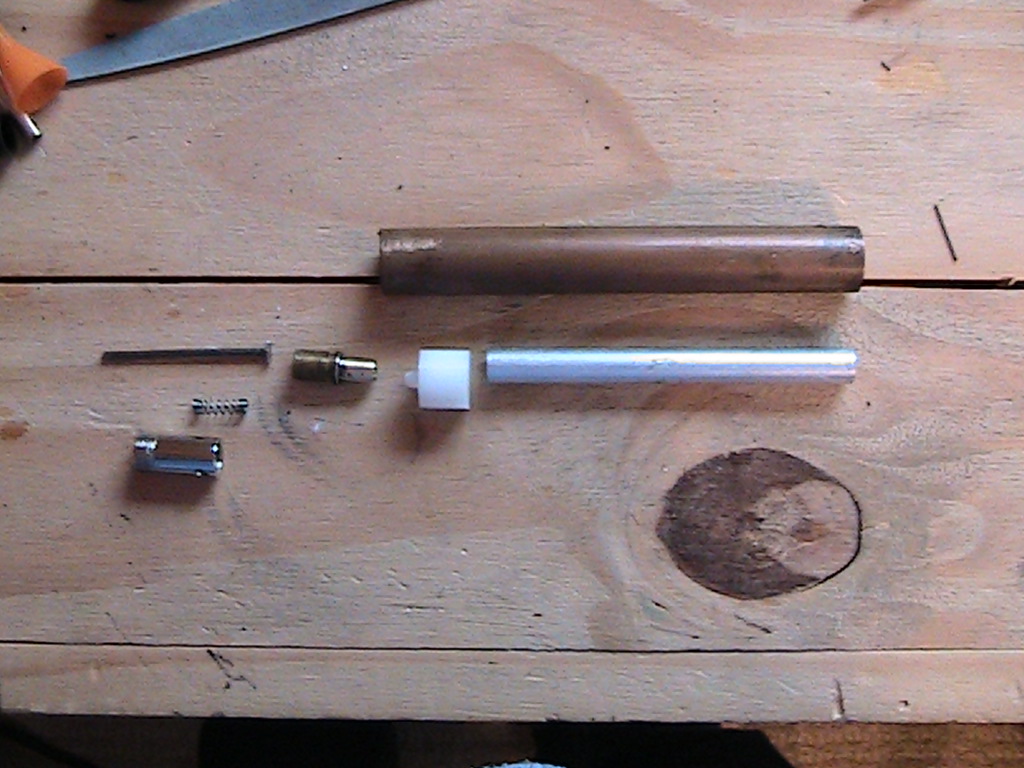 before epoxy and trigger mechanism<br />note that the little &amp;quot;tail&amp;quot; on the back of the piston was cut off and the back was hollowed out with a drill
