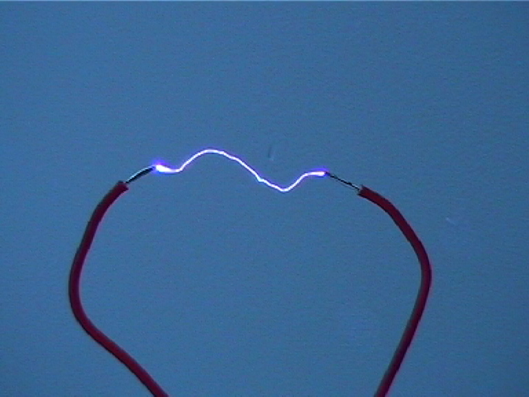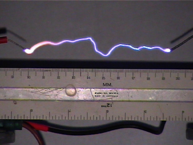The setup and a picture of a spark that came off the coil are below. My estimate is a 3/2 centimeters spark gap, which would ballpark the voltage around 30 kV, from what I've read. Moreover, this would allow a 3/8" spark gap in a hybrid with a 4:1 compression mixture.... The picture's a little grainy, because I took it from a video, of which my camera does not take very high quality.