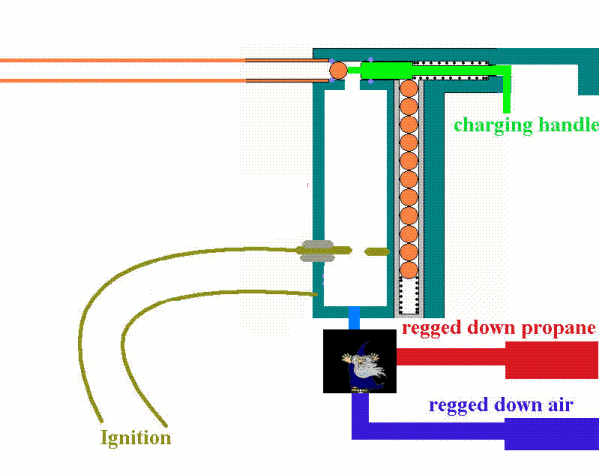 When the trigger is pressed and the mix ignited the round leaves the barrel and the bolt is shot back. The valve is still feeing air into the chamber, which purges it. A few ms later it returns to the original position and feeds propane, the bolt loads new ammo and seals the chamber.