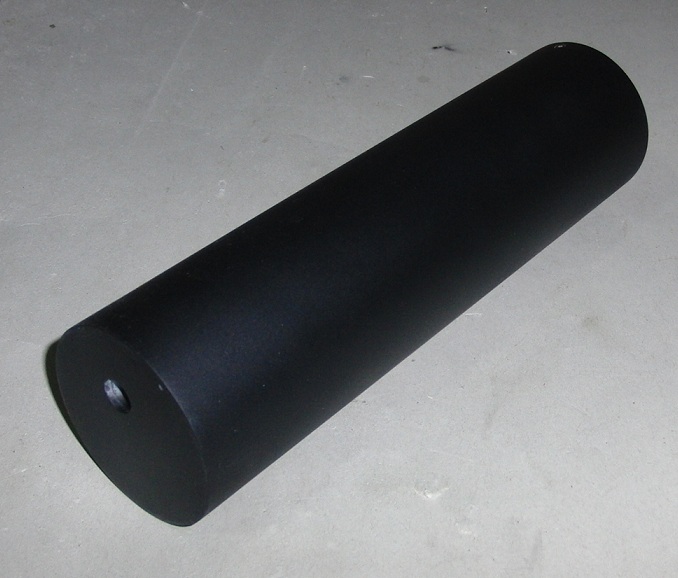 I decided to revisit the idea taking advantage of my improved fabrication facilities, herewith the result. Chopped off part of the plastic barrel sheath and epoxied on a brass sheath with a male 1/2" NF20 thread on the end, then made a 5" long 1" dia carbon fibre suppressor to fit, much smarter now :)