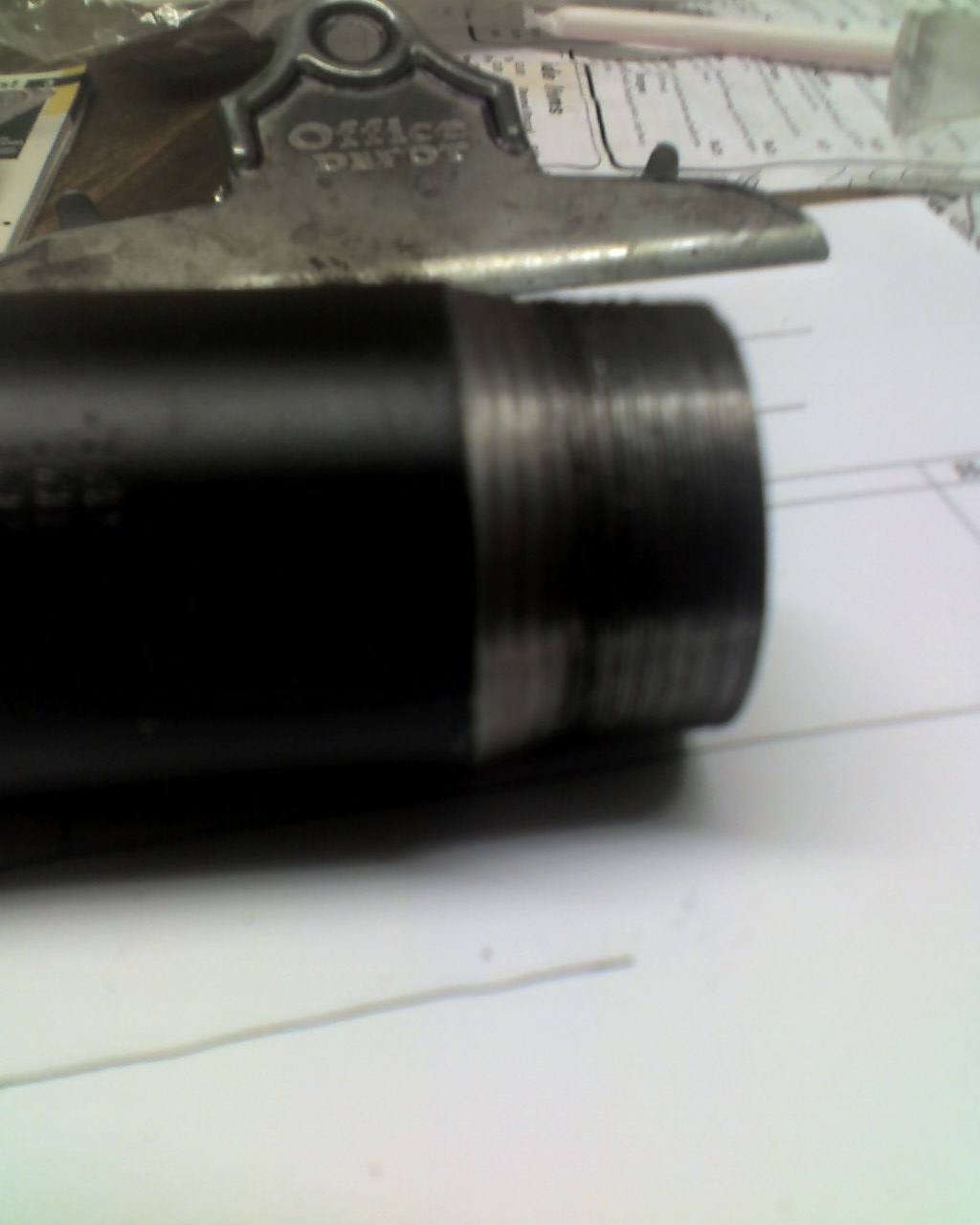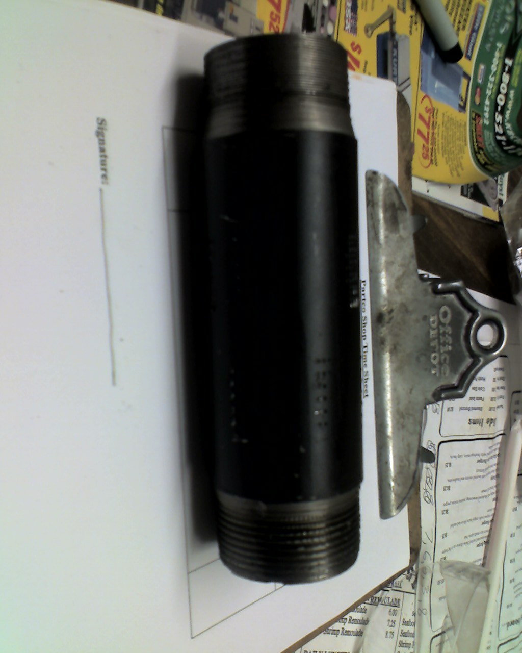 I went to the local Home Depot yesterday for a rush job at work to pick up a 6" long 1.5" black iron pipe nipple. I figured this would be fairly simple: if they don't stock it, they can cut it. Sure enough it wasn't stocked, so I asked an employee to cut one for me. All seemed well, he chucked the pipe up and began cutting, so I went and browsed the brass fittings to kill time. A few minutes later, he came up to me with the nipple wrapped up in some paper towels. I didn't bother to check the threads as I figure any fool could run that die machine, seeing as how its designed to be easy to operate. When I got back to the shop, I climbed up on the compressor and unwrapped the nipple. I hope these pictures do this piece of work justice.