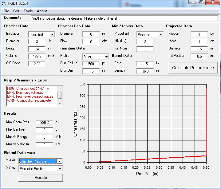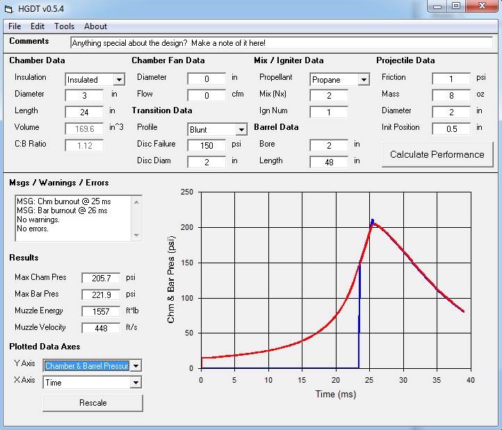 Well you'd better sit down for this then, with your numbers HGDT suggests that with a lightweight projectile in the 2 inch barrel you could go supersonic, while a heavy projectile in the 2.5 inch barrel you'll have muzzle energies approaching a 12 gauge shotgun slug:Again thanks for your time, that comment about it's energy relative to a .44 Magnum has completely made my day!