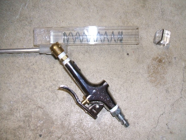 This thing is simply amazing. It empties itself in about 2 seconds (~250 rounds). The concept for this gun is totally new, as you may have seen from my sig. The body is square acrylic tubing (sweet!) and the vortex block is flat on it's side, below the gun. This is the second "full hole" vortex block I've made, because a partial hole wouldnh't work well for this gun. The bottom of the vortex hole is covered with aluminum sheet. The front is plugged with an acrylic cube. Another acrylic cube (thanks Modder) is the plunger, while another acrylic cube, with an O-ring on it, serves as the back plug. The O-ring doesn't completely seal the back, but the gun still shoots better than any other strafer I've ever made (keep in mind, that's 8 or 9). The blowgun is attached to the vortex block by a compression elbow, a tiny piece of 1/4" brakeline, and a drop of epoxy.