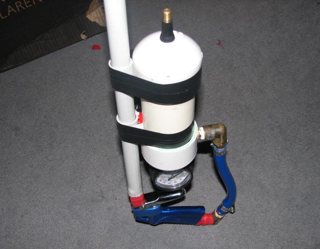This is my Pneumatic BB Sniper, it fires various things, such as my favorite, a sharp pop rivet wrapped in tape, or split sinkers wrapped in tape, 2 BB's wrapped in tape, theres lots of things i fire. The Gun is basically a Blow gun, Attached to a 2" Chamber With End caps (all pressure rated) With tire valve popped in, PSI gauge attached, and a 90 degree brass elbow leading away towards the blow gun, and attached to the blow gun is another 90 degree elbow, both attached together using pressure rated pipe and nipples, and other bit and pieces.
