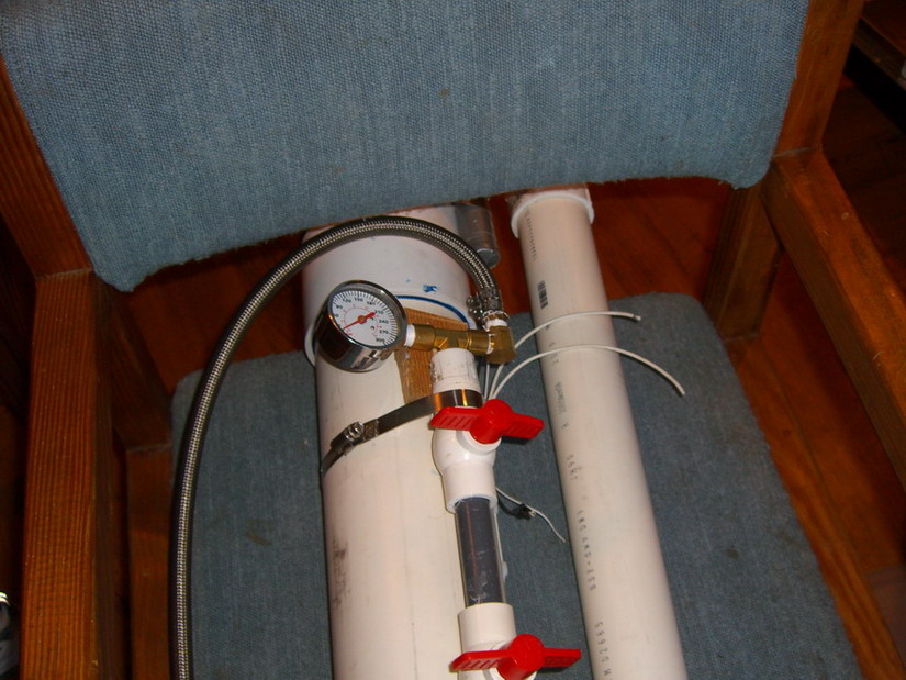 This is the newly built Potato Eliminator. I haven’t tested it yet. The chamber is an 18 inch long piece of 4 inch shc 40 PVC. On one end I glued a 4 inch female adapter and on the other a 4 inch coupling. In the coupling I glued a 4 inch spigot by 2 inch female thread bushing.
