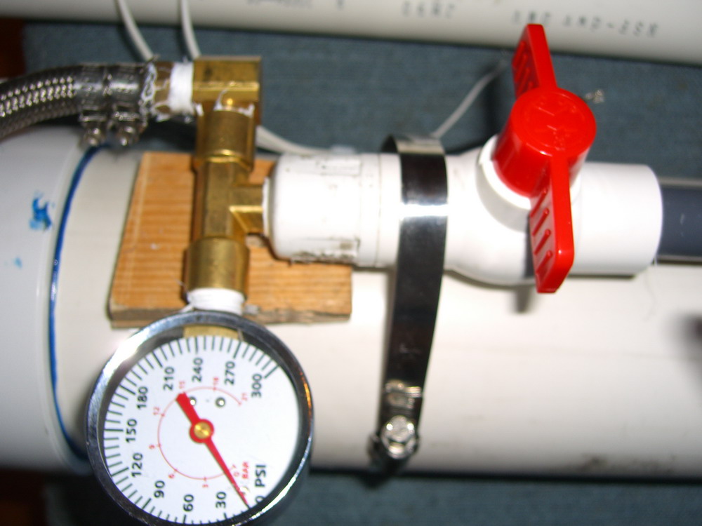 The propane meter is quite simple. Starting from the barrel I have a ¼ inch steel street elbow, a ¼ inch steel close nipple, a 1/4inch by1/2 inch steel coupling, a ½ inch sch 80 PVC close nipple, a ½ inch sch 40 PVC ball valve, a 4 inch long ½ inch sch 80 PVC nipple (this will vary based on volume of chamber), a ½ inch sch 40 PVC ball valve, a ½ inch sch 80 PVC close nipple, a ½ inch sch 40 cap with ¼ inch threads tapped into the top of it, a ¼ inch brass tee with a 1-300 PSI pressure gauge in one side and a ¼ inch brass street elbow in the other side, out of the elbow a ¼ inch by ¼ inch brass hose barb, connected to the barb is a length of braided hose used to hook up toilets, the other end if the hose is clamped to an old propane torch. All the sch 80 nipples are sprinkler risers and are available at any store that sells sprinkler supplies. The propane meter is tapped into the chamber at the end with the cleanout plug.