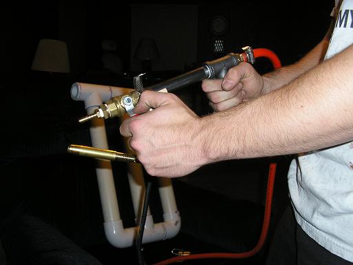 pimpman, not sure what you mean but if it was mine, i would have put a 90* bend where the cap is on the rear grip, and run a pipe straight forward and then capped it. to that pipe running parallel to the main body of the gun i would have clamped the torch to it. but like i said, i didnt design any of it but the chamber. and more parts means more money and the price was negotiated for a specific set up and thats what he got.