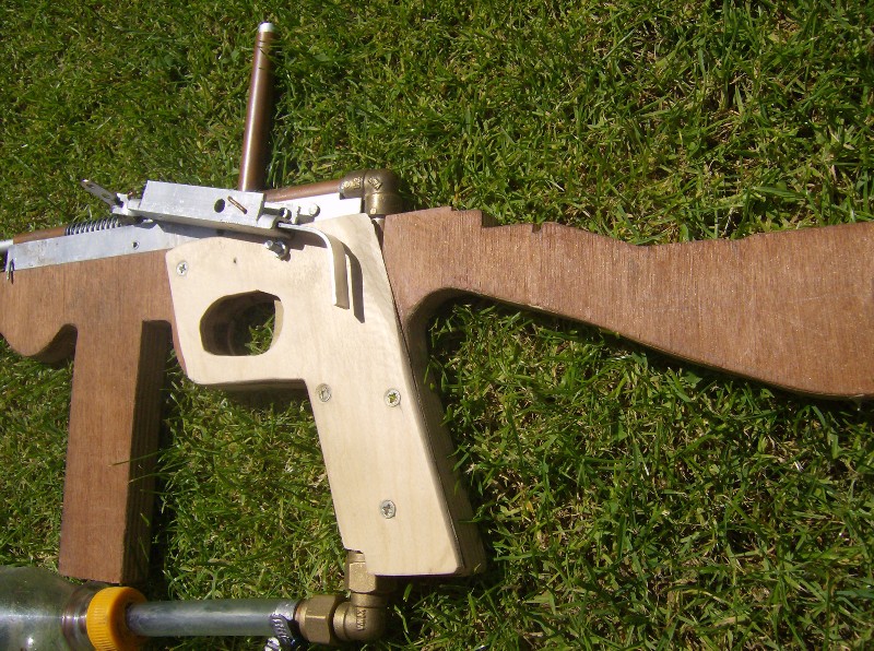 This homemade gun shoots 0.12gram bb balls at around 280miles/h. (450km/h) It works on a 1.5 liter coke bottle at 5bar operating pressure. It can shoot about 40 times on this bottle. It also has a gravity fed magazine. I also have a system to make sure that the balls dont roll out of the barrel and that there are no double feeds. At the moment I am working on a automatic airsoft gun which recocks on the pressure of the bottle as well; just like an uzi. So inother words this gun still needs to be recocked manually.