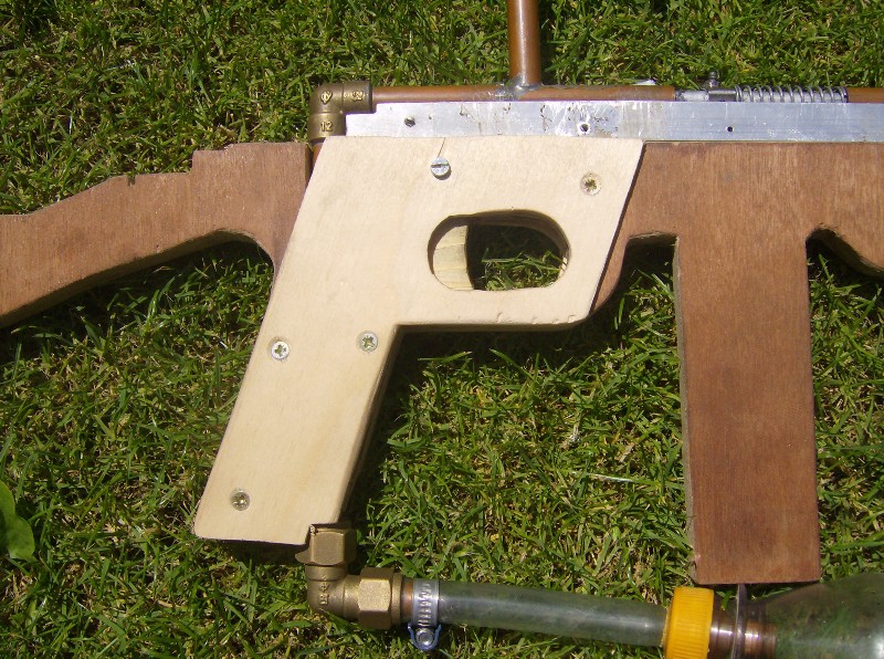 This homemade gun shoots 0.12gram bb balls at around 280miles/h. (450km/h) It works on a 1.5 liter coke bottle at 5bar operating pressure. It can shoot about 40 times on this bottle. It also has a gravity fed magazine. I also have a system to make sure that the balls dont roll out of the barrel and that there are no double feeds. At the moment I am working on a automatic airsoft gun which recocks on the pressure of the bottle as well; just like an uzi. So inother words this gun still needs to be recocked manually.
