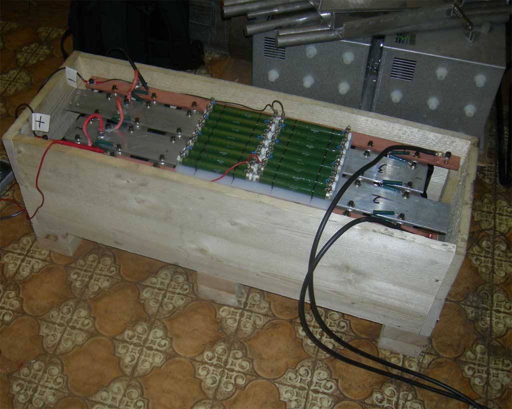 The capacitors are arranged in 3 parallel banks that are wired in series for 1200v and 40000uF.