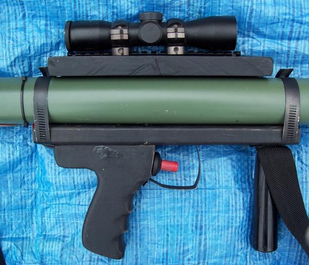 The scope is not really usable on a gun like this as alot of you know, mostly for looks. I use 10" long 1" diameter pvc rockets with flared bottom and bondo plug at the top, also i made a couple tips out of wood dowel sanded down. shot it 300 feet today a couple times using axe, limited range due to neighbors house.