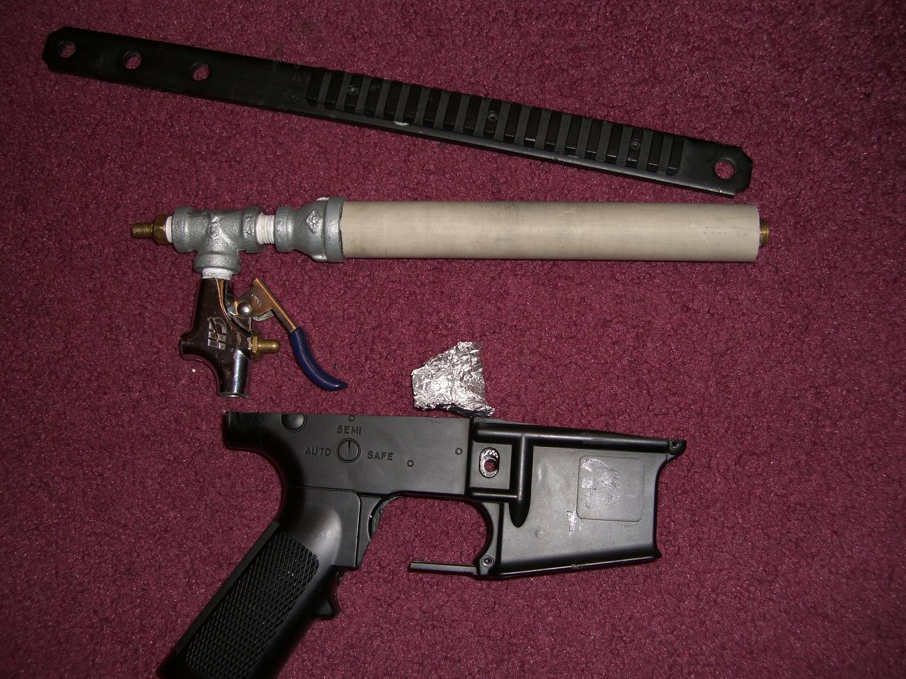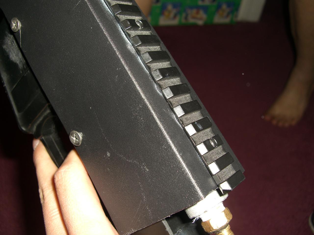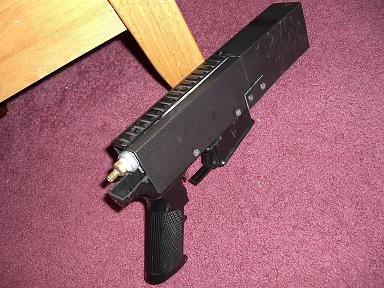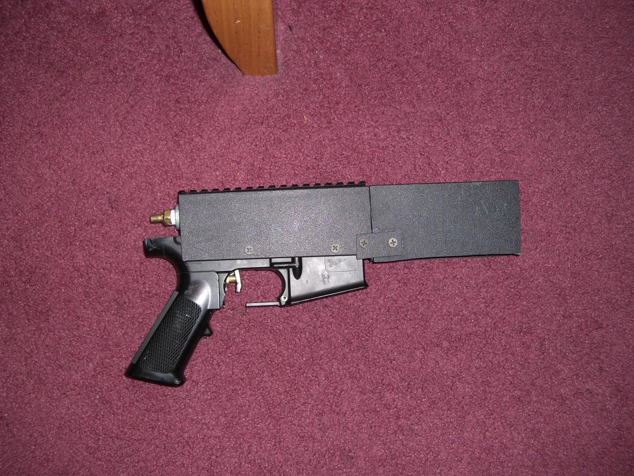 Body made from abs sheet and an old airsoft m4a1. My operating presures are only 120 psi from my compressor, I will operate this at 300-400 psi on when my freind finds my shocky....
