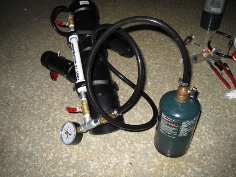 The fuel is propane, through a metering system made out of 1/4" galvanized fittings, 1/2" PVC, and some black acrylic tubing. I made a long hose coming from the propane tank, which ends in a compressor fitting for easy removal, so I can leave the tank on the ground. The pressure gauge is upside down at the moment, and I intend to get a different one as soon as I have the cash. I also used tubing to go from the second valve into the chamber, in lieu of using an elbow fitting. If anything goes wrong it is easier to disassemble this way.