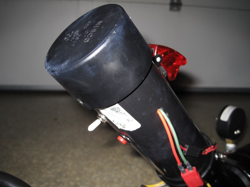 Also, I added a chamber fan to the system, controlled by a switch on the handle. All of the electronics, except the battery, are housed in the handle. A large aircraft switch with a cover arms the taser, but the fan works while it is armed or unarmed. A small red button on the bottom of the handle triggers the ignition.